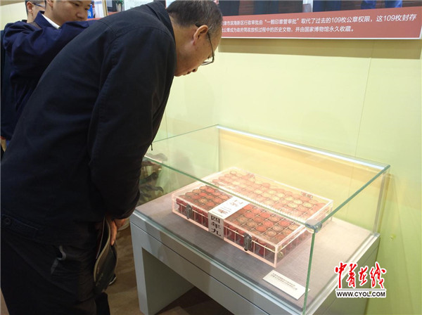 在第三展区,天津市滨海新区行政审批局办事大厅封存的109枚审批公章吸引了许多参观者的驻足。据工作人员介绍,2014年5月20日,天津市滨海新区行政审批局挂牌成立,原来分散在18个不同部门的216项审批职责归并到了1个部门,1枚公章取代了109枚公章,“这109枚公章真实见证了政府简政放权的过程。”