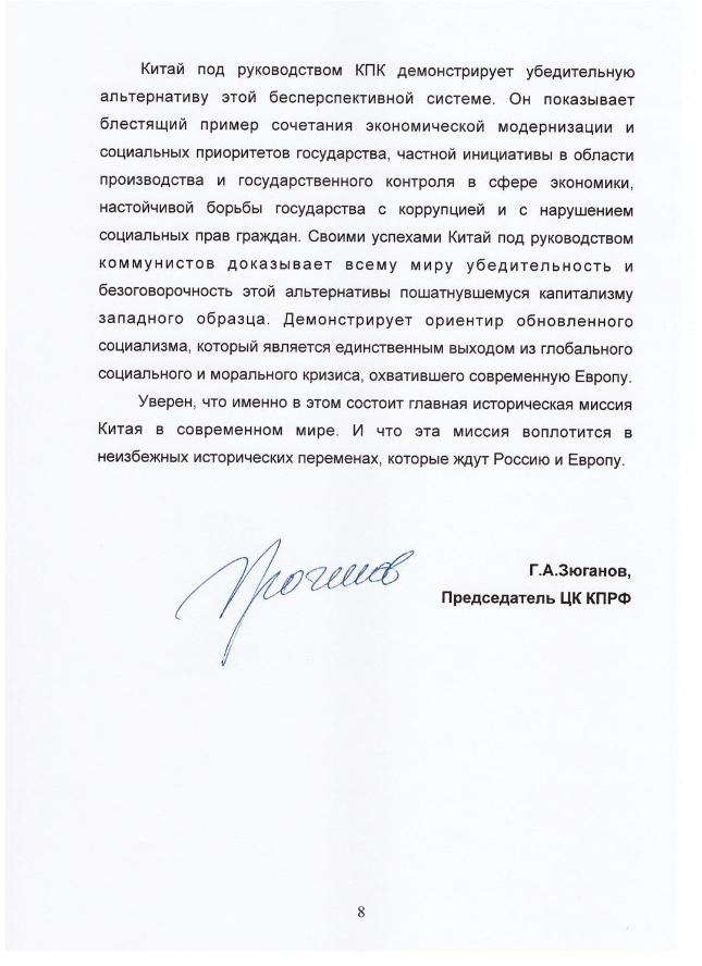 久加诺夫说,中国特色的社会主义原则,是中国在几十年里取得成就的基石。睿智的,经过深思熟虑的,无条件地对社会负责的态度——这是中国改革者的特点,正是在中国共产党的领导下,中国人民取得了无可争议的、举世瞩目的成就,使中国成为我们这个时代的强大国家。伴随这些成就取得的,是人民不断稳定增长的福利,比如居民收入增加,努力缩小城市与乡村差距等。中国共产党应该成为我们的榜样。