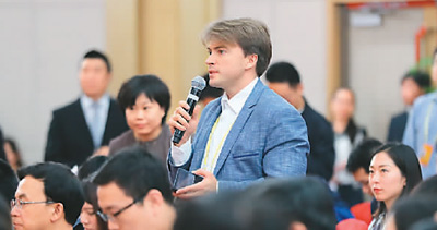 10月19日,在“推进全面依法治国”集体采访上,柬埔寨国家电视台记者提问。(人民网记者 王天乐摄)