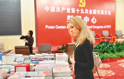 图为在十九大新闻中心,书刊赠阅台吸引了记者驻足观看。(人民网记者 于 凯摄)