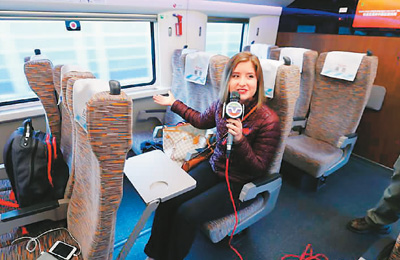 10月17日,美国中文电视台记者在京津城际高铁上采访。(中新社记者 富 田摄)