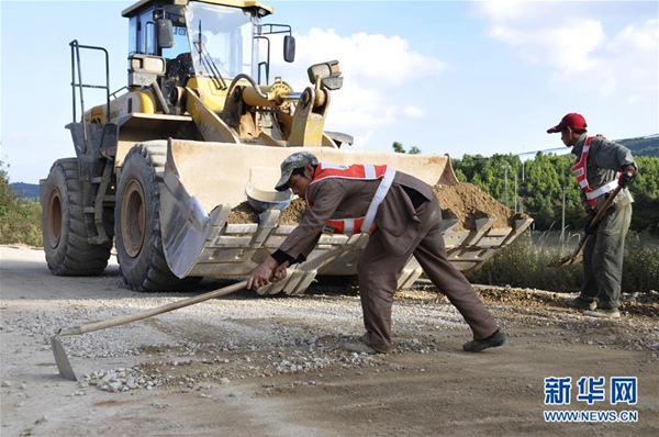 工人在云南省会泽县驾车乡的乡村公路施工现场忙碌(10月20日摄)。(新华社记者 白靖利 摄)