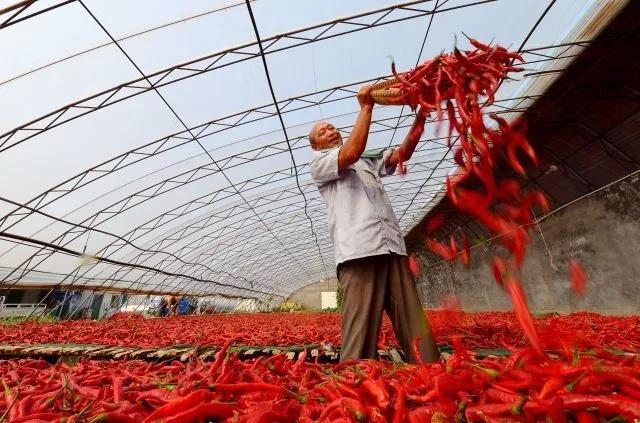 △河北省邯郸市鸡泽县魏青村村民在晾晒辣椒(2017年9月11日摄)。