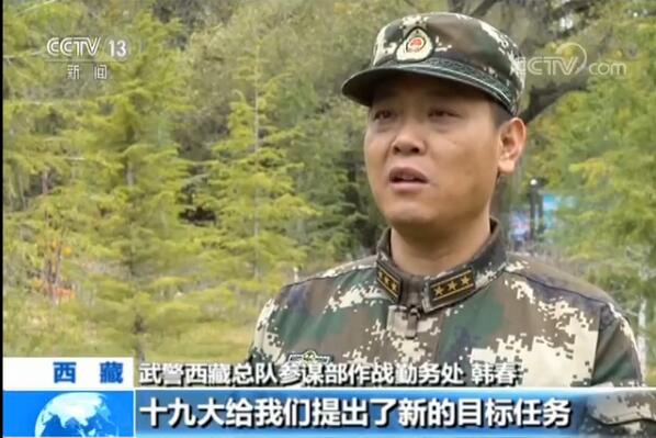 武警西藏总队参谋部作战勤务处 韩春:十九大给我们提出了新的目标任务,在新时代,作为守卫祖国边疆的武警官兵,按照习主席讲的那样,一定要有新气象新作为,始终扎根高原、立足岗位,为实现强军目标作出积极贡献。