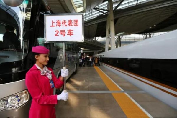▲2017年10月16日,上海市十九大代表乘坐“复兴号”高铁列车抵达北京南站。