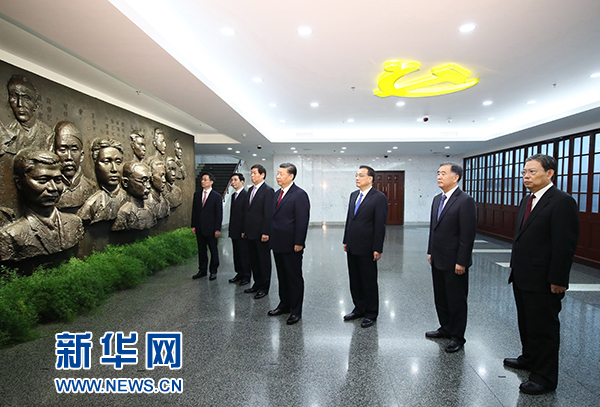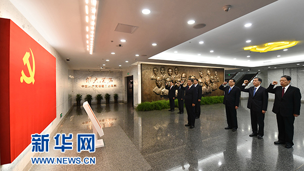 在瞻仰中共一大会址、参观《伟大开端——中国共产党创建历史陈列》后,习近平带领其他中共中央政治局常委同志来到中共一大纪念馆宣誓厅,面对党旗一起重温入党誓词。