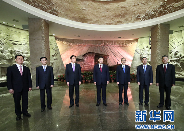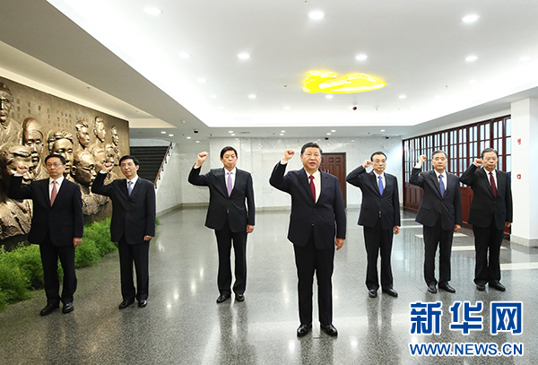 在上海中共一大会址纪念馆,习近平带领其他中共中央政治局常委同志一起重温入党誓词。新华社记者 李涛 摄