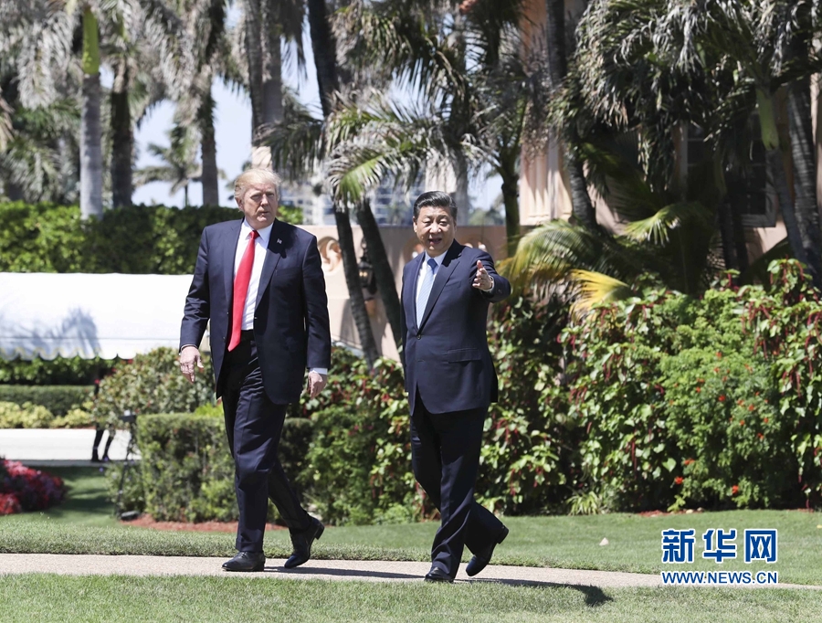 2017年4月7日,国家主席习近平在美国佛罗里达州海湖庄园同美国总统特朗普举行中美元首第二场正式会晤。会晤后,习近平同特朗普到秀丽宜人的海湖庄园中散步,在轻松友好的气氛中继续就两国友好合作进行讨论。 新华社记者 兰红光 摄
