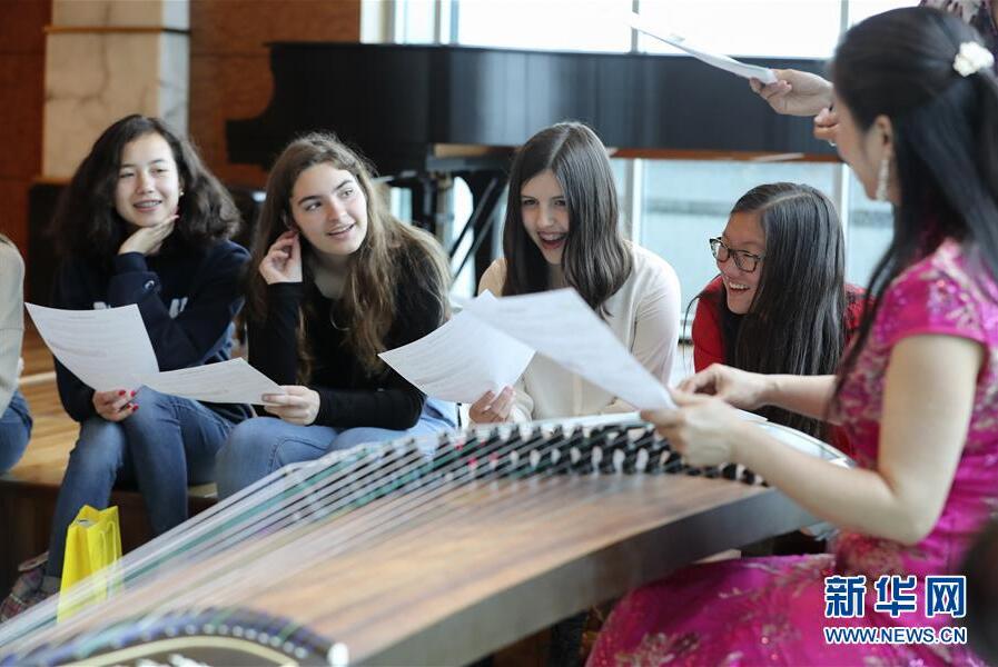 2017年5月5日,在中国驻美国纽约总领馆举行的“感知中国”活动中,一名老师为美国学生展示古筝弹奏。新华社记者王迎摄