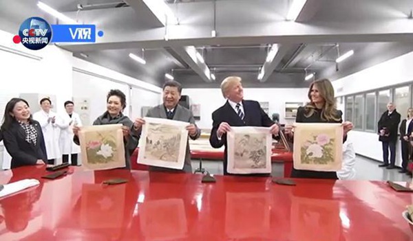 两国元首夫妇先后观赏了钟表、木器、金属器、陶瓷、纺织品、书画等文物修复技艺展示,并共同观看了珍品文物展。习近平和夫人彭丽媛邀请特朗普夫妇体验书画装裱工序的关键环节——托画心。