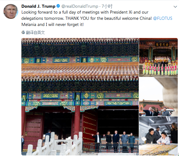 特朗普在社交媒体上发布了几张在故宫博物院参观时的照片,并写道,“我非常期待明天与习近平主席以及我们的代表团进行的全天会谈。中国,谢谢你的盛大欢迎!我和梅拉尼亚都不会忘记的!”