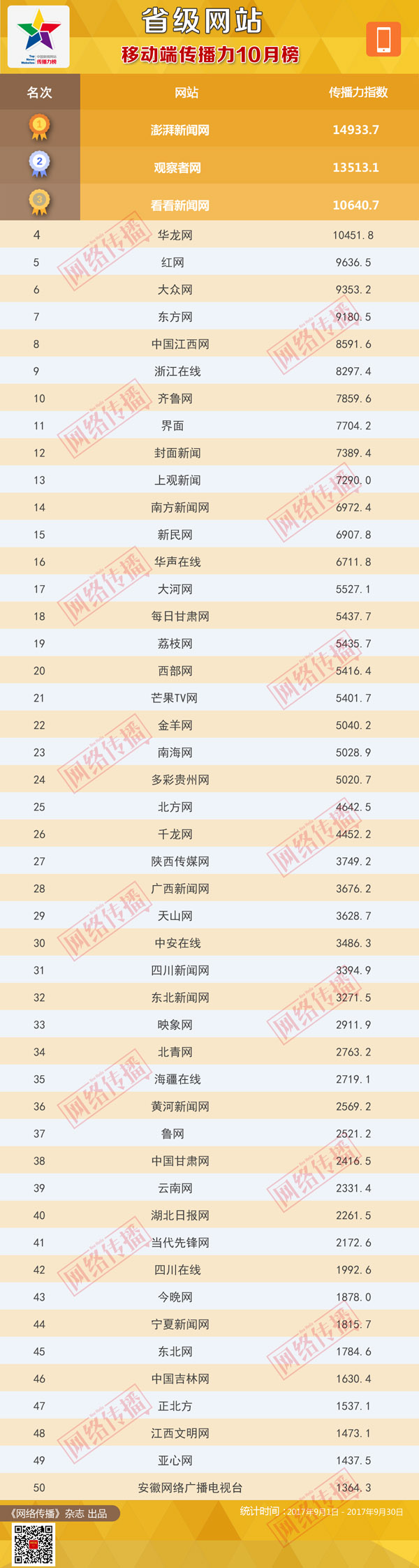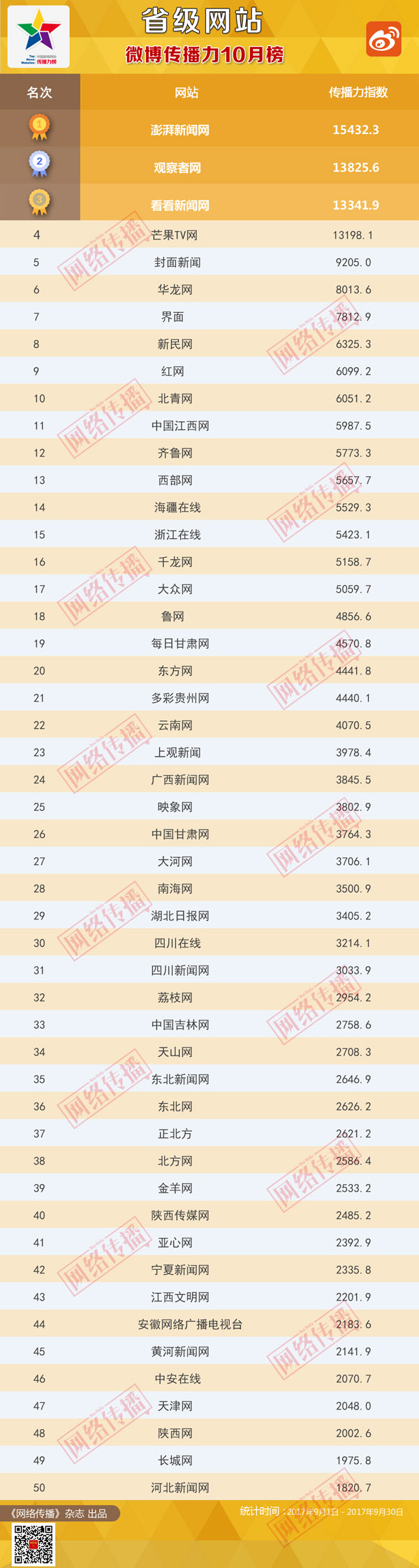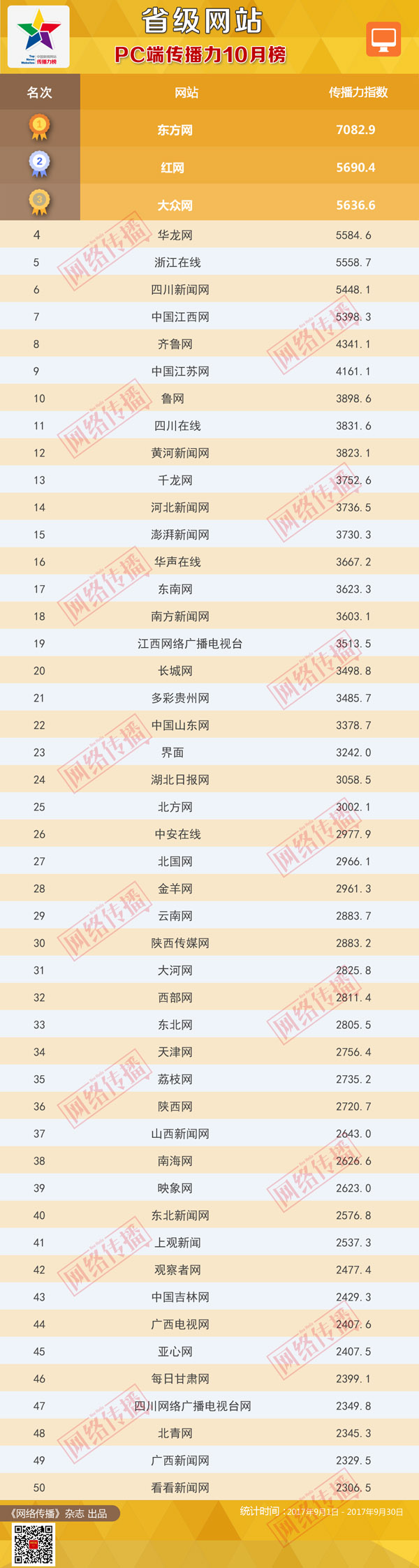 中央网信办《网络传播》杂志倾力打造的“省级网站传播力2017年10月榜”今日发布。