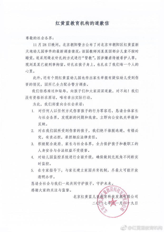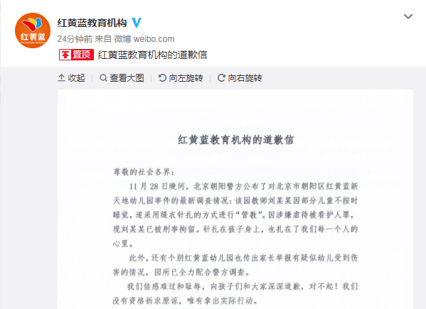 红黄蓝教育机构发布道歉信:深感耻辱,将升级监控