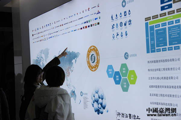 记者们在环能德美环保装备有限公司的展示栏边驻足讨论。(中国台湾网 李宁 摄)