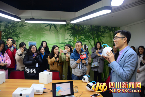四川新闻网南充12月11日讯(记者周鸿摄影报道)“我们一起出去玩吧!”“好啊!”今天上午,在南充高新孵化园里,“聚焦‘155’战略见证大城崛起”2017年全国网络媒体采访团对这个可与人类对话的圆形机器人十分感兴趣。“太可爱了。”