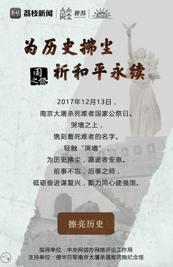 为了永不忘却的纪念,2017年国家公祭日来临之际,荔枝新闻和我苏客户端推出特别策划“为历史拂尘,祈和平永续”互动。愿擦亮的名字守护历史的真相,愿和平的祈愿温暖寒冬的殇城。