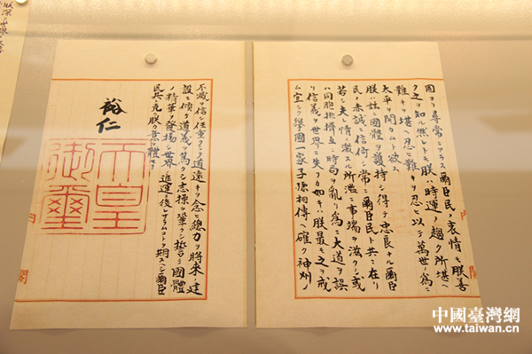 日本裕仁天皇的投降诏书。(中国台湾网 李宁 摄)