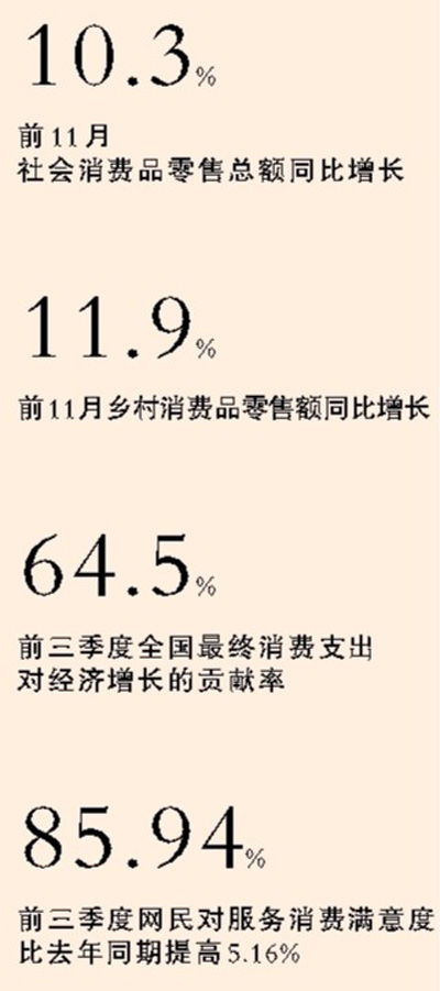 今年1—11月,社会消费品零售总额331528亿元,同比增长10.3%。“今年我国消费情况总体不错,体量这么大还能保持两位数增长,成绩可喜。”中国人民大学副校长、国家发展与战略研究院执行院长刘元春说。