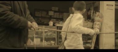 失落至极的赵亮无助坐在街边吃面包,看到路边有人擦鞋,便又想起自己和眼盲的爷爷擦鞋赚钱相依为命的日子。