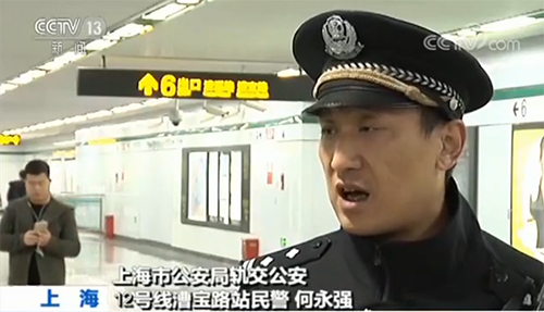 上海市公安局轨交公安12号线漕宝路站民警何永强说,当时孩子浑身抽筋,咬破了舌头,嘴里在出血,然后我们地铁站值班站长为了防止再次伤害,在他嘴里放了一支笔。