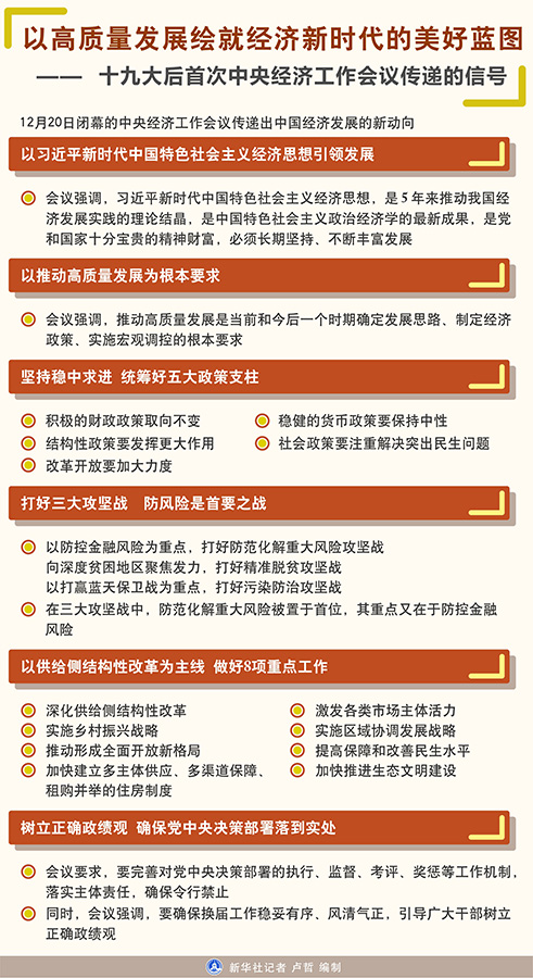 新华社北京12月20日电 题:以高质量发展绘就经济发展新时代的美好蓝图——十九大后首次中央经济工作会议传递的信号