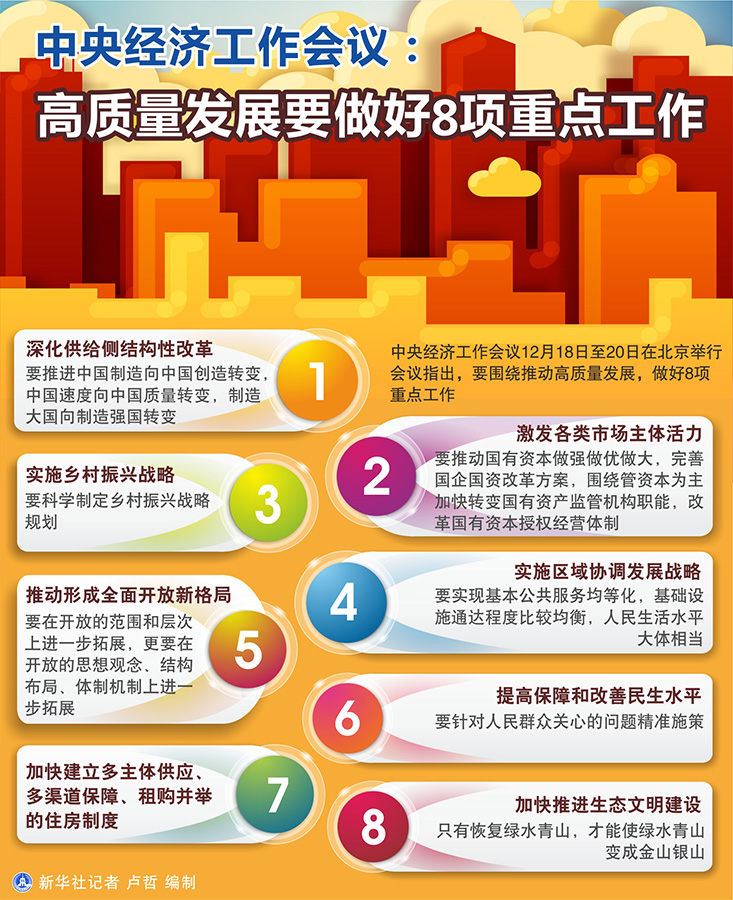 随着十九大后首次中央经济工作会议闭幕,“高质量发展”成为社会热词。在这一被外界视为中国经济“风向标”的重要会议上,习近平总书记发表重要讲话,明确推动高质量发展这一根本要求,提出了8项重点工作。迈向2018,中央经济工作会议释放出温暖人心的政策信号:实现高质量发展,为了13亿人的幸福。