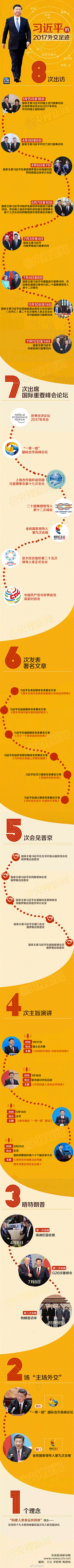 【#回首2017# 习近平外交足迹的12345678】2017年,从家门口到大洋彼岸,从G20到APEC,除了"一带一路高峰论坛"和"金砖厦门会晤"两场"主场外交",习近平主席共5次踏出国门,足迹遍布亚、欧、美三大洲,出访8个国家……习近平主席在2017年继续构建中国外交"朋友圈",推动大国关系、周边关系的稳定与发展↓