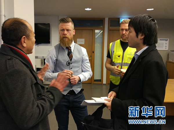 12月27日,在冰岛雷克雅未克,中国驻冰岛大使馆工作人员与冰岛国家救援中心人员交谈。新华社发