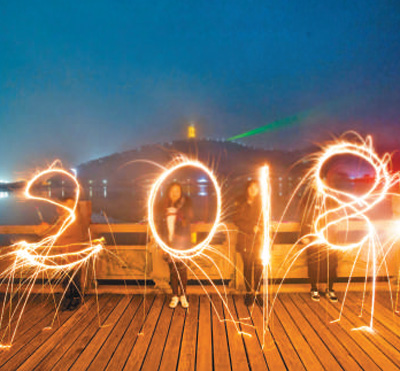江西都昌县游客用烟花棒画出“2018”字样。傅建斌摄(人民视觉)