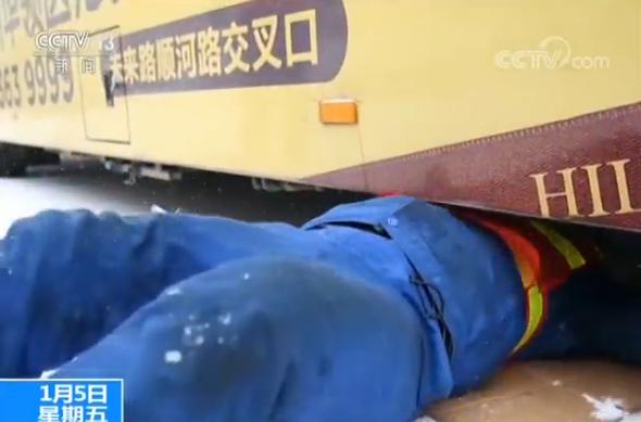 一张废旧硬纸壳往雪地里一摊,背对故障车辆一躺,双脚用力、身体一窜,几秒钟的功夫,抢修队员就已经钻到车底。