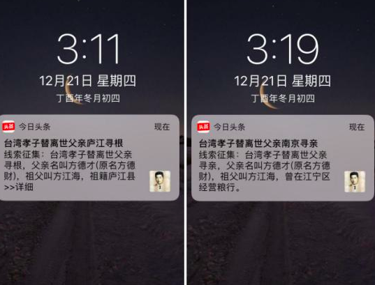 接到求助信息后,头条寻人立刻发布了《今日头条两岸寻亲:台湾孝子替离世父亲寻根 寻找合肥或南京的亲属》的寻亲消息,把他精准地弹窗推送给了安徽合肥和江苏南京的网友,短短4个小时之后,就成功联系上了方志鹏要找的大陆亲人方英怀。