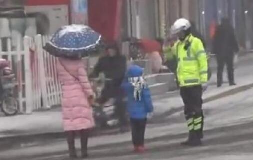 暖闻:山东邹城交警雪中护幼童过马路 告别时互敬军礼