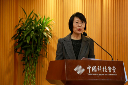 图为中国药学会副理事长兼秘书长丁丽霞发表致辞。