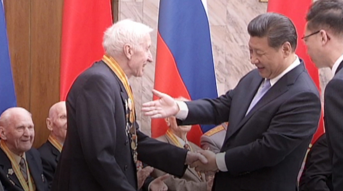 Xi awarded medals to Russian veterans for their contributions to China’s victory against Japanese aggression and the World Anti-Fascist War. Many of the veterans attending the event had limited mobility, so Xi brought the medals over to them.