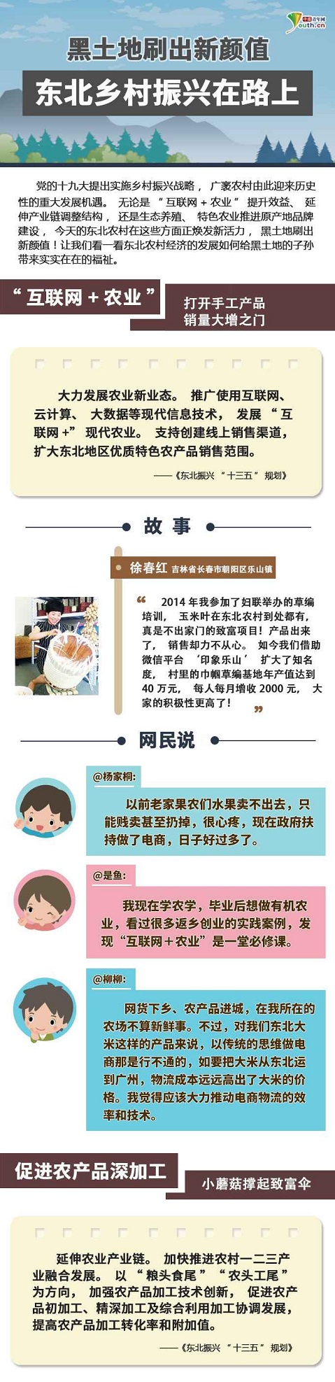 中国青年网北京1月23日电(记者 杨月 实习记者 胡云茹 曹若鸿)党的十九大提出实施乡村振兴战略,广袤农村由此迎来历史性的重大发展机遇。无论是“互联网+农业”提升效益、延伸产业链调整结构,还是生态养殖、特色农业推进原产地品牌建设,今天的东北农村在这些方面正焕发新活力,黑土地刷出新颜值!让我们看一看东北农村经济的发展如何给黑土地的子孙带来实实在在的福祉。