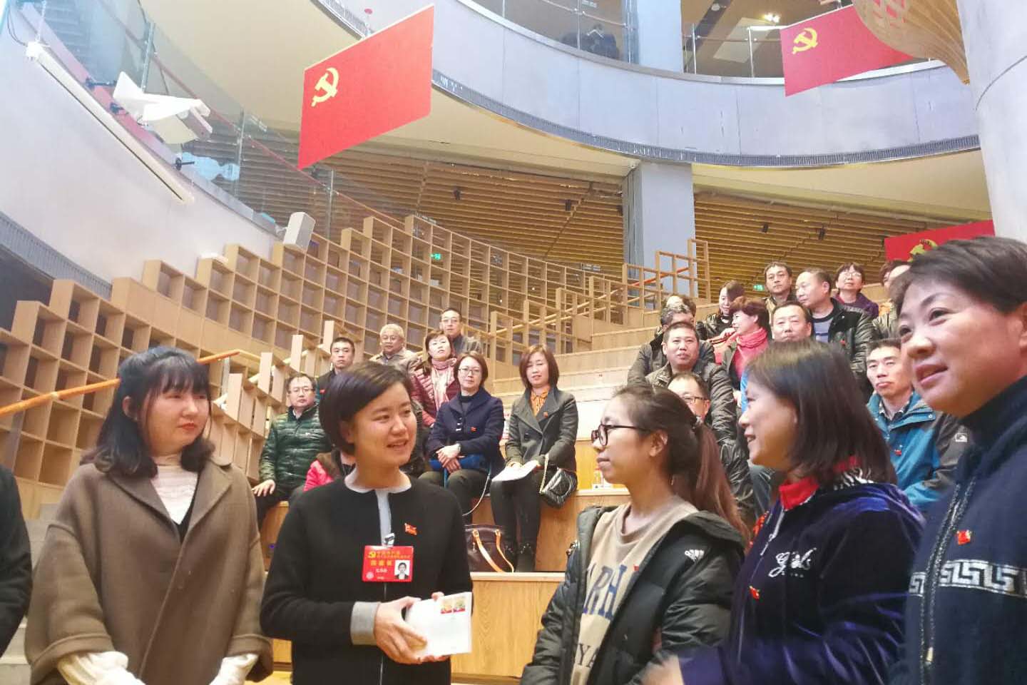 党的十九大代表、沈阳市苏家屯区八一街道团工委书记、党群办主任、官立堡村党支部第一书记吴书香(左二)在沈阳玖伍文化城与听众沟通。何勇 摄