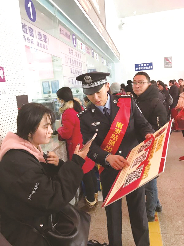 南京站民警热心为旅客服务。