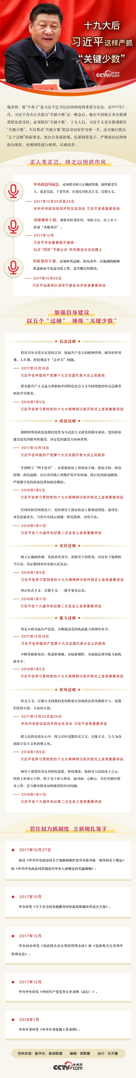 央视网消息:抓“牛鼻子”是习近平总书记治国理政的重要方法论。自2015年2月,习近平首次正式提出“关键少数”这一概念后,他在不同场合多次强调要把党建设好,必须抓住“关键少数”。十九大后,习近平又多次强调抓住“关键少数”,不仅要求“关键少数”把洁身自好作为第一关,还对他们提出“五个过硬”的新要求,更出台多部新规,扎紧制度笼子,严明政治纪律和政治规矩。央视网特进行梳理,以飨读者。