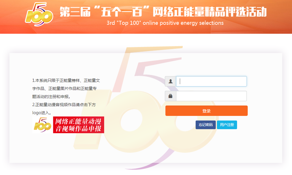 第三届“五个一百”网络正能量精品评选活动申报页面
