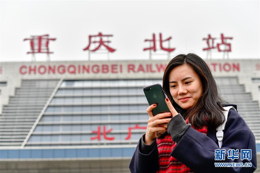 2月9日,在重庆火车北站北广场上,张羽靓用手机查阅自己的订票信息。随着智能移动通讯设备的普及,许多出行的旅客使用智能手机购票、订餐、支付等,一些旅客还用手机记录自己的行程。今年25岁的重庆女孩张羽靓是一名摄影爱好者,2月9日,她从重庆北到大足南,用手机记录了一次“指尖上的智能春运”。新华社记者 刘潺摄