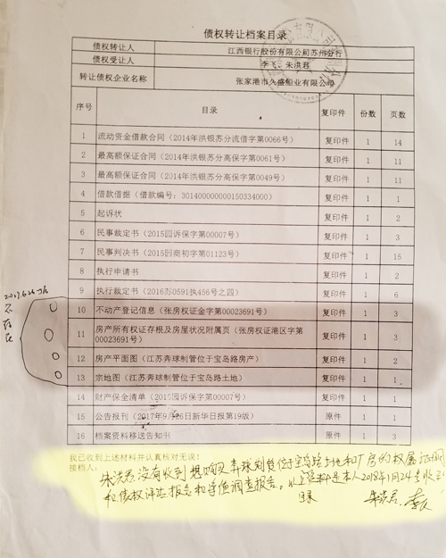 2018年1月24日,债权转让协议签订4个多月之后,在苏州银监分局的催促下,江西银行苏州分行才将债权转让档案资料(刊登《债权转让公告》的2017年9月26日新华日报第19版和档案资料移送告知书为原件,其余均为复印件)移交给李飞、朱洪君。