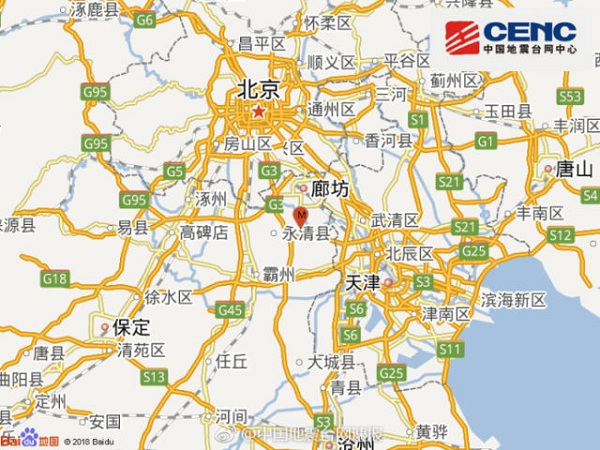 2018年2月12日18时31分,河北省廊坊市永清县发生4.3级地震,图为震中位置。(图片来源:中国地震台网)