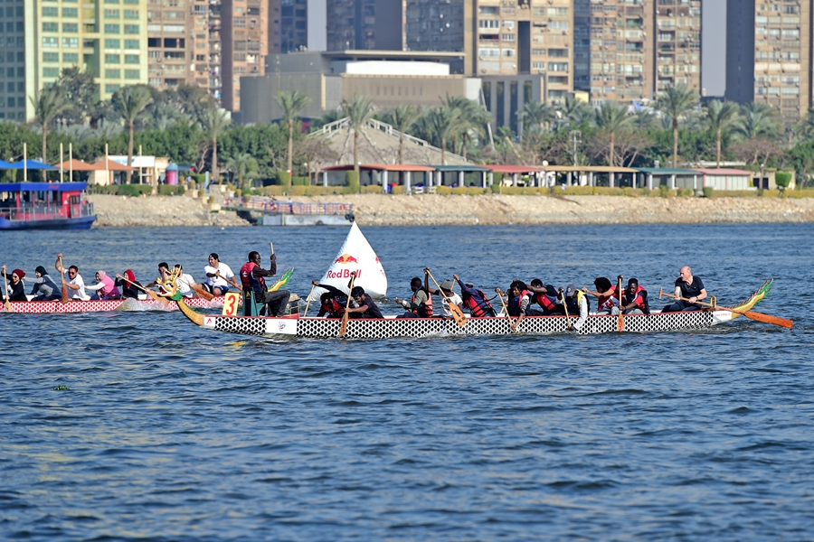 来自中国、埃及、法国等国的12支代表队在尼罗河上竞逐,共庆中国新春。(图片来源:新华社)