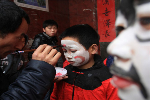 正月初七这天,也是不走亲访友的,因为从清晨“赶野猫”的仪式就开始了。首先,挑选强壮善跑的孩子组成队伍,然后由年长者分发服装,为他们化妆。