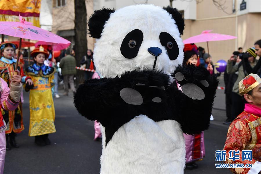 2月25日,在法国巴黎,大熊猫造型人偶参加春节彩妆大游行。当日,法国华人举行春节彩妆大游行,庆祝中国农历狗年的到来。新华社发(杰克·陈 摄)