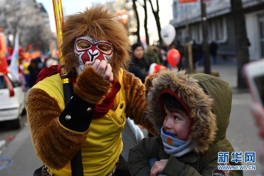 2月25日,在法国巴黎,“美猴王”在春节彩妆大游行中与一名小男孩互动。新华社发(杰克·陈 摄)