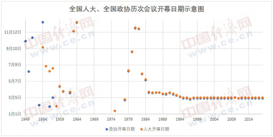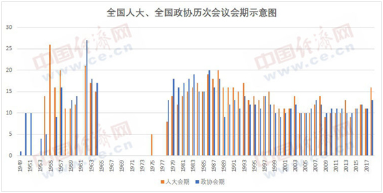 经济日报-中国经济网记者统计了全国人大、全国政协历次会议的举行时间和会期,得到以下图表: