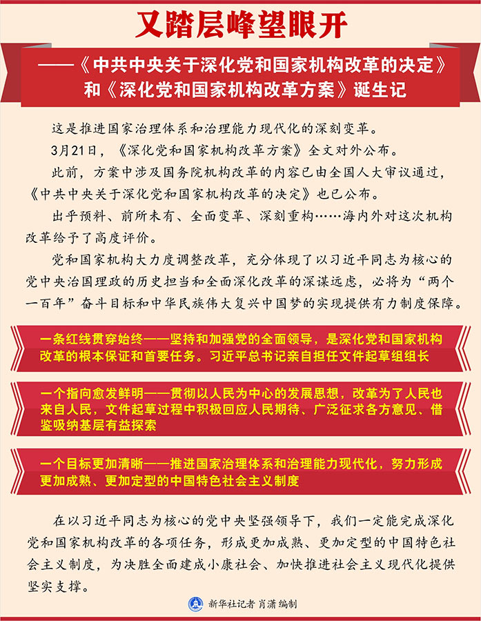 在以习近平同志为核心的党中央坚强领导下,我们一定能完成深化党和国家机构改革的各项任务,形成更加成熟、更加定型的中国特色社会主义制度,为决胜全面建成小康社会、加快推进社会主义现代化提供坚实支撑。(记者秦杰、陈二厚、刘铮、姜琳、施雨岑)