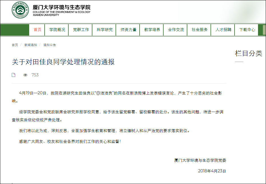 厦大最新通报出来了:给予发布辱华言论的田佳良留党察看、留校察看处分。