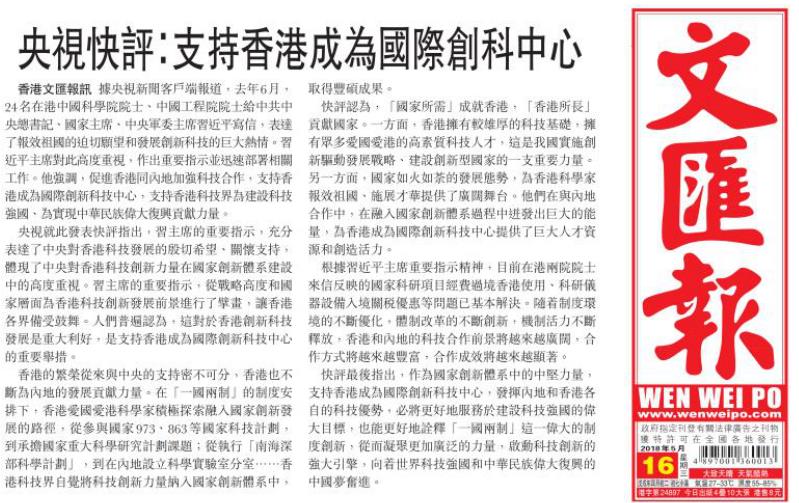 5月16日出版的香港《文汇报》转发中央广播电视总台央视新闻刊发的《央视快评》指出,习近平主席作出一项重要指示,促进香港同内地加强科技合作,支持香港成为国际创新科技中心。报道具体内容如下: